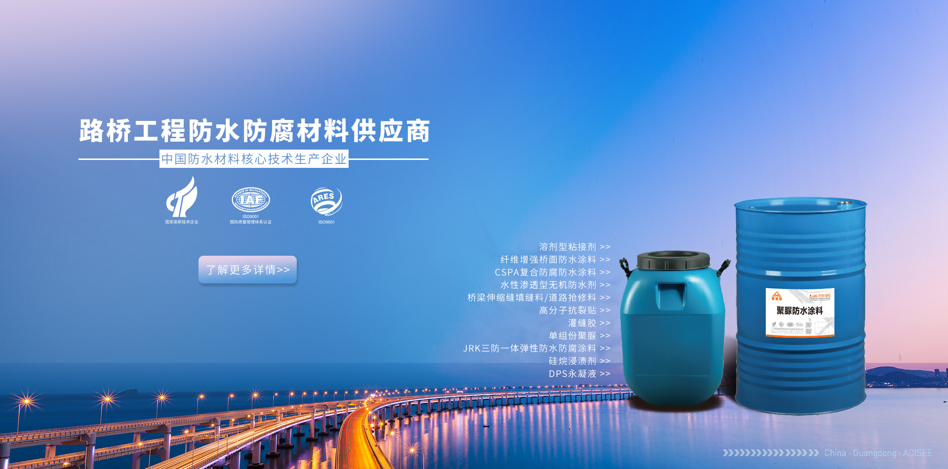 修繕補(bǔ)漏防水系列 廣東愛迪斯新型材料科技有限公司廣州分公司 隔音隔熱系列 路橋及防腐防水系列 家裝工程防水系列 修繕補(bǔ)漏防水系列專業(yè)承接路橋防水防腐工程施工及防水材料銷售,路橋防水工程遍布全國各地,多年的技術(shù)經(jīng)驗(yàn)積累了一整套橋面防水病害處理方案,專業(yè)的路橋防水技術(shù),配套路橋防水施工設(shè)備,圓滿完成路橋防水施工任務(wù),用戶滿意度評價(jià)高,處橋梁防水行業(yè)技術(shù)領(lǐng)先水...